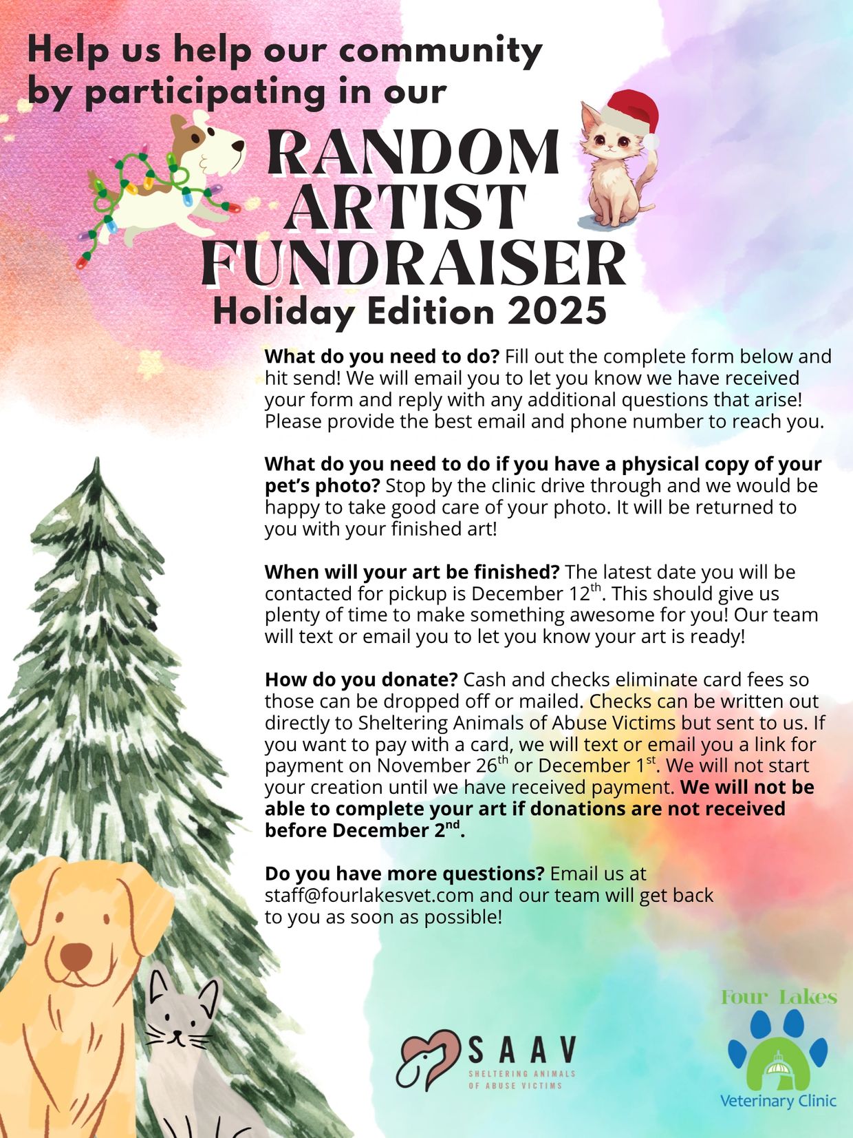 Each work of art is $25 per pet. We can create one framed piece per pet or combine pets in a piece. If your photo features multiple animals, please indicate if you would like them in individual frames or all the animals together! If you are paying by card, please indicate if you would like us to send the payment link for more than the fee incurred per pet. Extra donations are not required, but anything extra received goes to SAAV! Fill out the form below to get started!