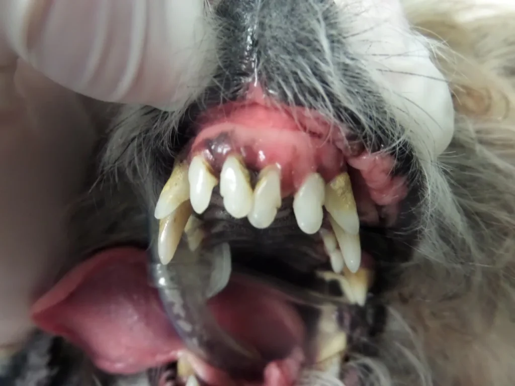 I check your pet’s teeth at every wellness visit. There are many signs of dental disease that I’m assessing: amount of tartar, gingivitis (that red line along the gum line that signifies bacterial infection), fractured, loose, and missing teeth, resorptive lesions (like cavities that enter the root canal), and pain from just opening the mouth. After 20+ years, I’m pretty immune to bad breath, but that is often the first thing owners notice. Bad breath = infection and means your pet needs a dental cleaning!